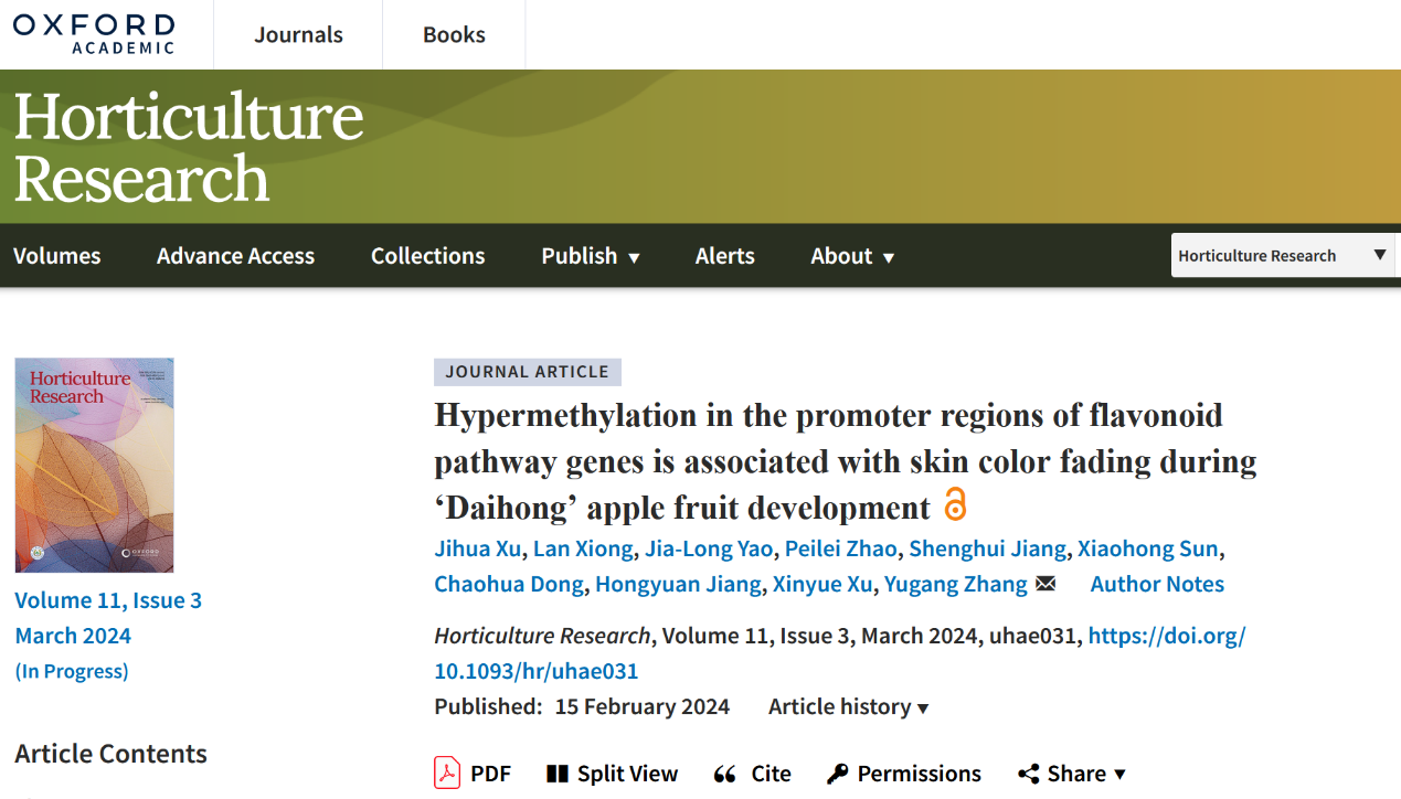 近日,mkmksport张玉刚教授团队在中科院一区Top期刊Horticulture Research发表题为Hypermethylation in the promoter regions of flavonoid pathway genes is associated with skin color fading during ‘Daihong’ apple fruit development的研究论文。该研究以mkmksport苹果育种团队选育的R1R6型红肉苹果品种‘黛红’为试材,结合遗传背景分析、代谢物分析、转录组、甲基化组及分子生物学手段解析了DNA甲基化参与苹果果皮褪色的机理。