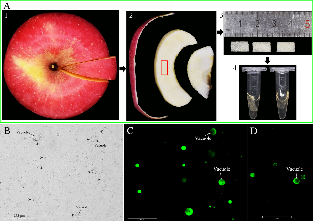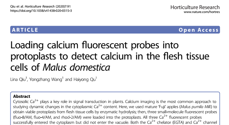 2020年6月,mk体育果树生理与栽培课题组在园艺领域顶级期刊Horticulture Research(一区)在线发表了题为“Loading calcium fluorescent probes into protoplasts to detect calcium in the flesh tissue cells of Malus domestica”的研究论文。该论文首次发现Fluo-8/AM等小分子荧光探针可以染色苹果果肉胞质中的Ca2+,可用于检测细胞质中Ca2+的时空变化。mk体育硕士研究生仇丽娜为本论文第一作者,mk体育王永章教授和屈海泳副教授为论文的共同通讯作者。该论文得到了国家重点研发计划项目(2016YFD0201120)的资助。