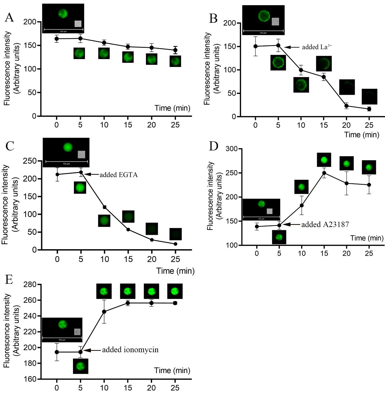 Fig. 3 Fluorescence changes in Ca2+ in the same protoplast within 25 min. Pictures were taken every 5 min.