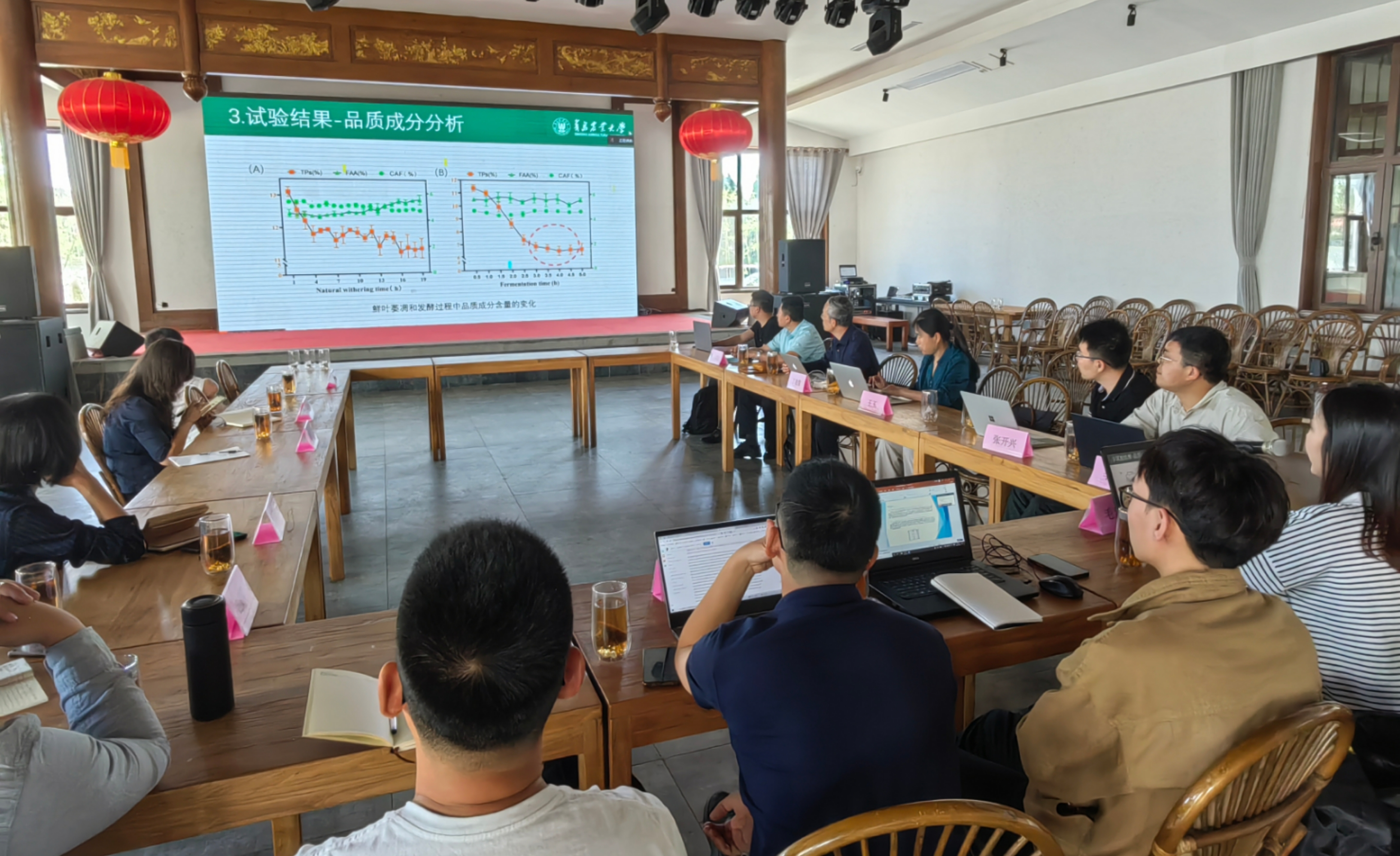 崂山茶智慧化生产及加工技术研究与应用项目是由青岛市科技局下达的2021年度科技惠民专项,该项目将在茶园气象数据采集、茶园生态与精准栽培管理系统研发、茶树主要病虫害实时监控、茶树新梢生长动态监测技术及采收决策、茶叶加工过程中原料特性监测与关键工艺参数控制等方面开展系统全面的研究。研讨会上,参与项目研究的硕士研究生李赫、毛艺霖、薛懿威等系统汇报了近期研究进展,项目组成员对有关技术研发内容及目标进行了认真探讨,并详细讨论了尽快推动技术落地的各项措施。