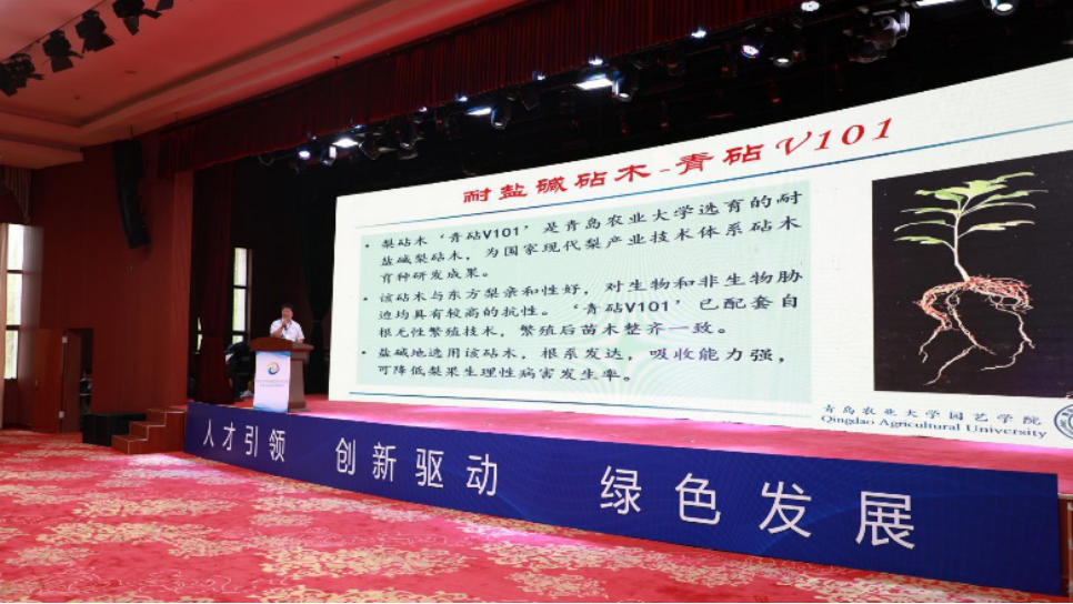 为深入贯彻落实习近平总书记重要指示要求,围绕国家所需、发挥垦利所长,聚力抓好盐碱地综合利用和生态农业创新发展,2022年6月29日,由中共东营市委组织部、东营市科技局、东营市农业农村局、东营市水务局共同参与指导,中共垦利区委、垦利区人民政府举办了“黄河三角洲盐碱地综合利用暨生态农业创新发展论坛”。国家梨产业技术体系砧木评价与改良岗位科学家、mk体育李鼎立教授及团队成员刘建龙副教授参加了会议。会议中,李鼎立教授为国家现代梨产业技术体系产业示范园进行揭牌,并详细推介了国家梨产业技术体系砧木评价与改良岗位成果,包括梨耐盐碱砧木、品种以及配套栽培技术。同时为更好服务国家黄河流域生态保护和高质量发展战略,李鼎立教授和垦利区林业发展服务中心、农业农村局、东营黄河三角洲果树产业技术研究院、山东省林业龙头企业东营市泰欣农林发展有限公司、东营三冠园林有限责任公司围绕耐盐碱梨生态高质量发展,在梨砧木育种、梨生态高质量栽培方面进行了交流研讨,共同谋划展开深入合作。