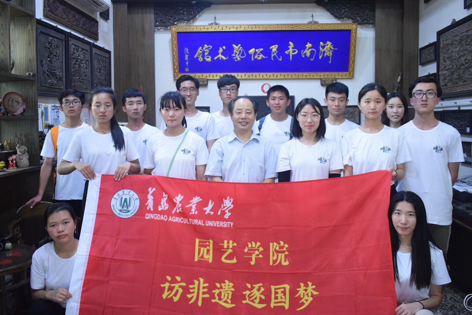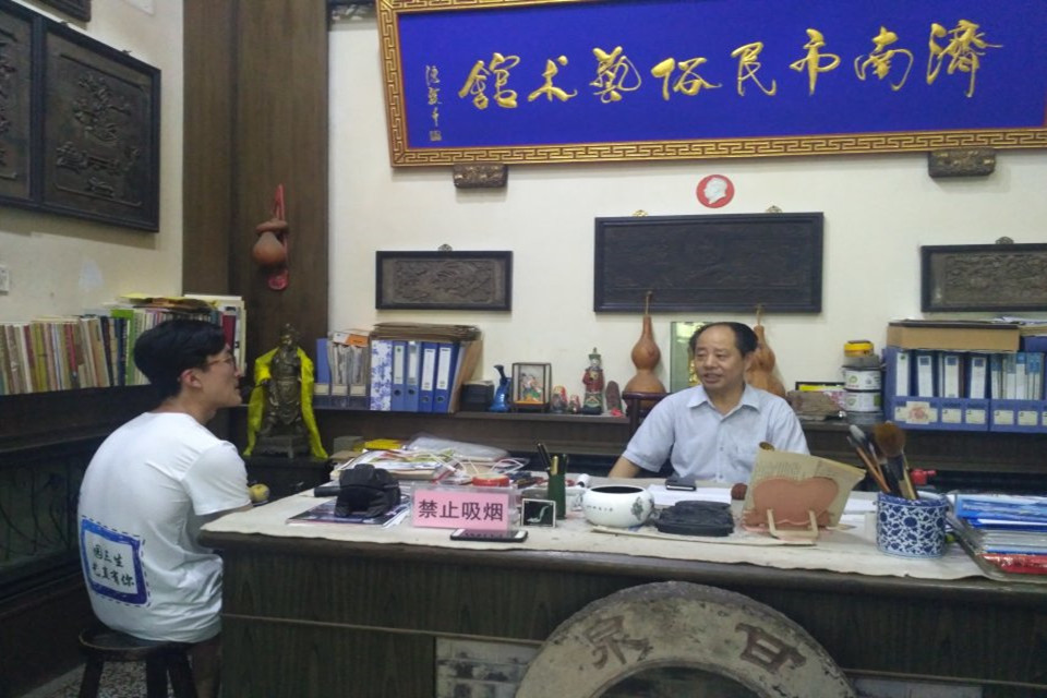 为进一步加强对民俗文化的了解,深入研究非物质文化遗产发展状况,拜访完高桂英老人后,实践团又来到了济南市民俗艺术馆。济南市民俗艺术馆,是于2002年成立的一所公益文化事业单位,承担全市的民间文化的抢救与保护工作;研究齐鲁民俗文化的历史与现状,开展民俗文化艺术研究;举办民俗文化艺术收藏、展览等工作。馆长刘学斌于2004年成立了民俗艺术公司,让众多民间大师有了“家”,培养了众多杰出民俗艺术专业人才,促进了齐鲁民俗文化及旅游事业的交流与发展。