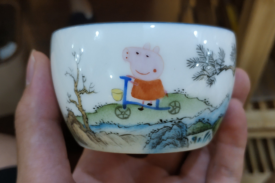 在传统工艺中,结合现代元素产生的“小猪佩奇”杯。