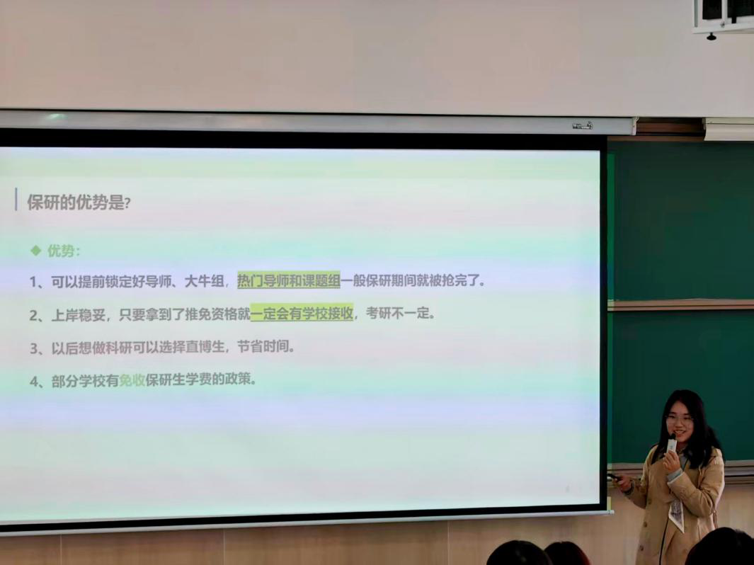 本次宣讲邀请了优秀员工代表园艺(创新)2201班员工尤思月。她结合自身经历,围绕专业知识学习、学科竞赛、社会实践、预推免经验等方面开展分享。她详细介绍了自己如何平衡课程学习与科研项目,在面对实验难题时如何查阅文献、与导师同学沟通协作,最终在老员工创新创业竞赛中取得优异成绩的过程。同时,她还分享了参与乡村振兴社会实践的见闻与感悟,鼓励新生们要将专业所学与社会需求相结合,在实践中增长才干、锤炼品格。谈及保研经历,她鼓励同学们尽早明确目标,注重日常积累与能力提升,制定科学的学习计划,保持积极心态应对挑战。