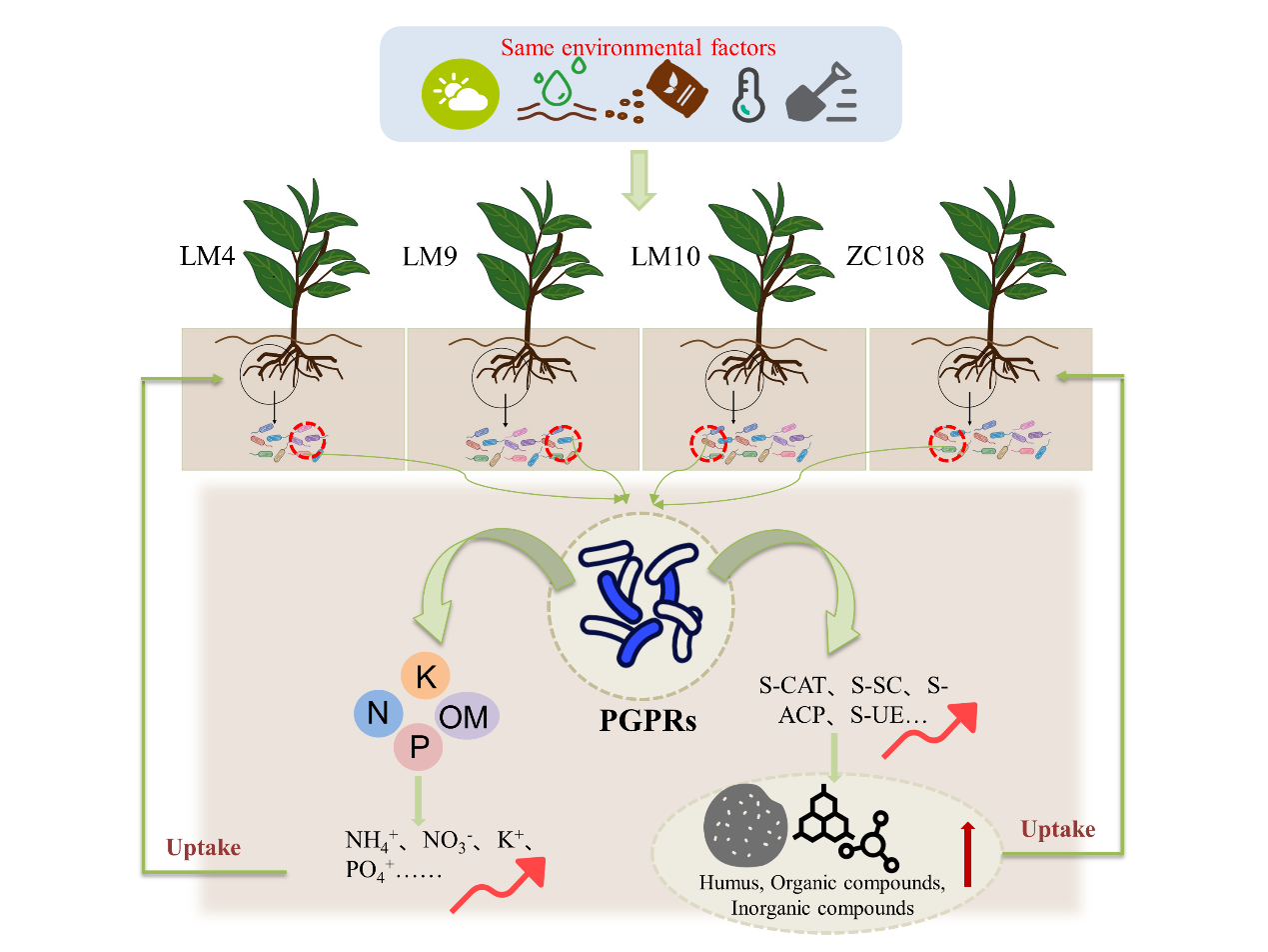 3.土壤酶活性也存在显著差异,LM9的蔗糖酶活性显著高于LM4、LM10和ZC108;LM9、LM10和ZC108的过氧化氢酶活性显著高于LM4;LM4的脲酶活性显著高于其他三个品种。