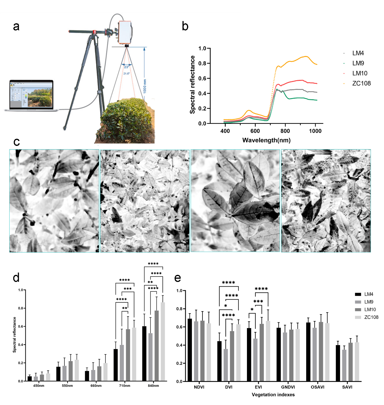 1.不同茶树品种的冠层植被指数存在显著差异,ZC108在蓝光至近红外波段的光谱反射率高于其他三个品种,其DVI和EVI值显著大于其他三个品种,表明其叶覆盖度较大;而LM4、LM9和LM10的NDVI值大于ZC108,表明这三个品种的氮需求量较大,生长状况较好。