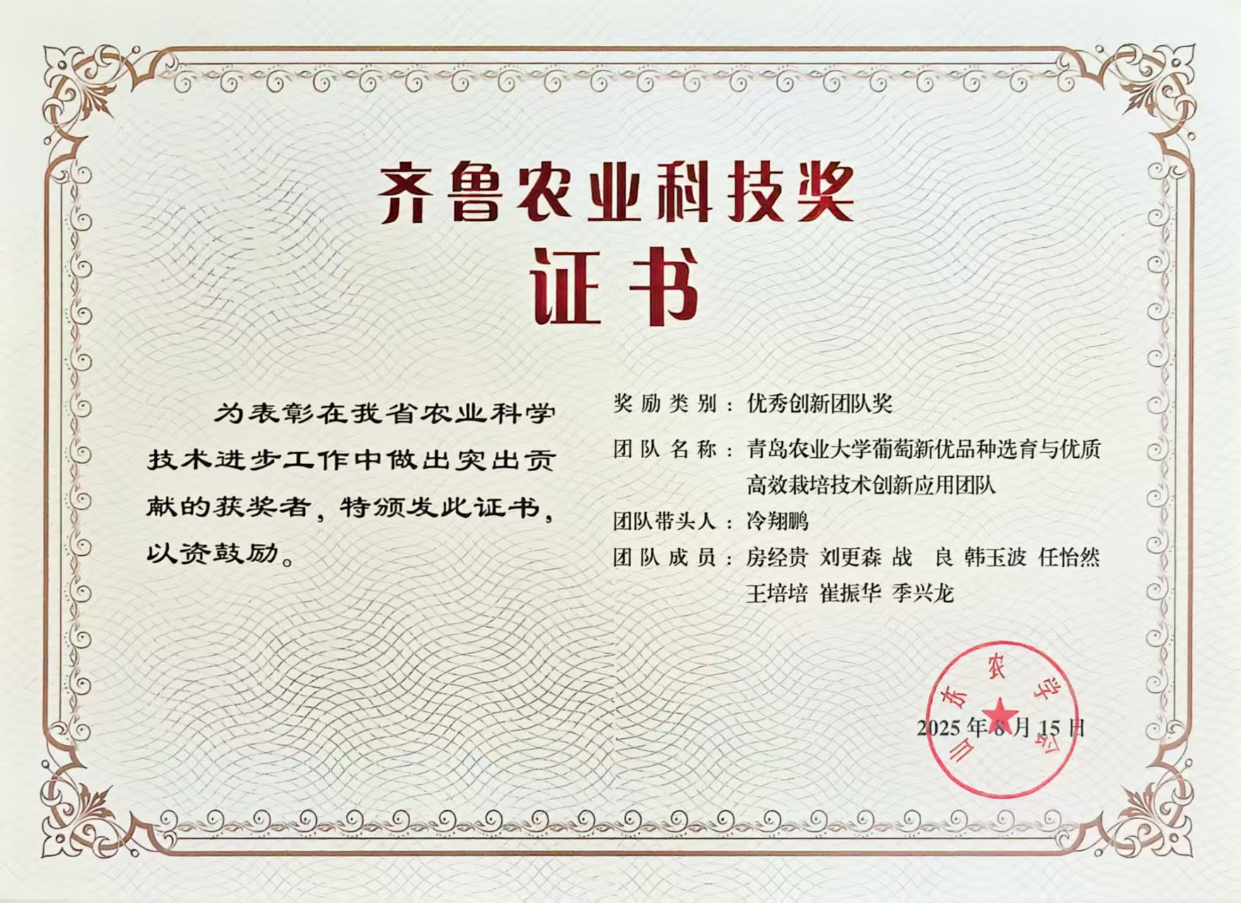 mkmksport葡萄新优品种选育与优质高效栽培技术创新应用团队围绕葡萄产业高质量发展,构建了集重要农艺性状调控机理研究、新品种选育、良种良苗生产、高效栽培技术研发与推广于一体的“研育繁推”葡萄全产业链体系。该团队显著推动了葡萄产业的提质增效与可持续发展,有效提高了农民的经济收入,取得了显著的经济效益、社会效益和生态效益。此次获奖是葡萄科学与工程团队继2023年度山东科技兴农奖优秀项目奖一等奖之后的再次获奖,表明该团队持续为葡萄产业的高效发展贡献着“青农力量”。