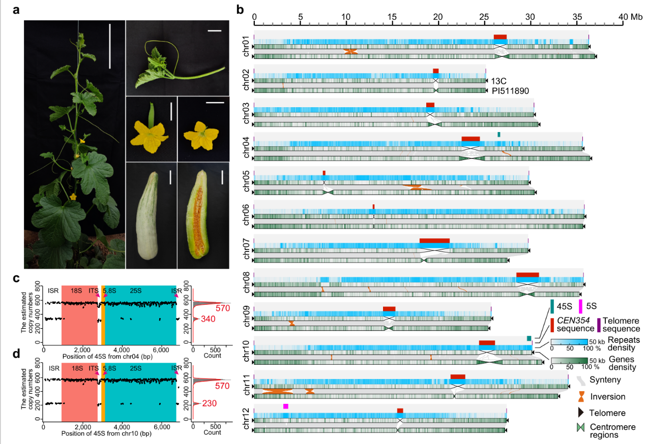 研究团队以优良栽培高代自交系13C为研究对象,利用PacBio HiFi、ONT超长读长和Hi-C等多种测序技术,成功组装出375.64 Mb的高质量端粒到端粒(T2T)甜瓜参考基因组。该基因组包含12个着丝粒和24个端粒,BUSCO完整度高达98.5%,并首次对甜瓜中难以组装的45S rDNA区域进行了准确拷贝数估算,揭示其在栽培型和野生型之间存在显著差异(图1)。