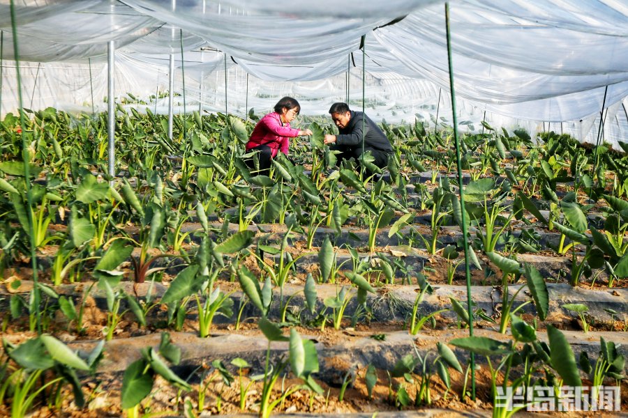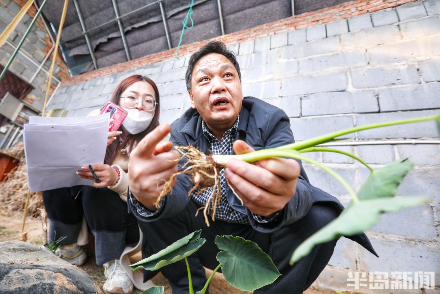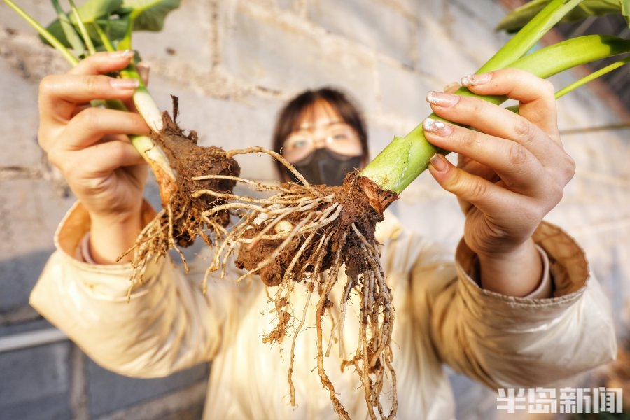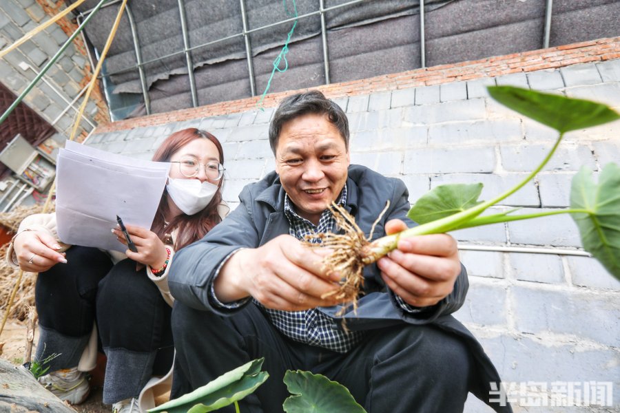 3月2日,青岛市即墨区南邱家白庙村的一处温暖的大棚里郁郁葱葱,3万余棵芋头苗长势旺盛,达到了可以移栽入田的标准。几位专家带着员工在这里下地观察研究,采集数据,看着挖出的芋苗根系的长势健壮,大家喜上眉梢。