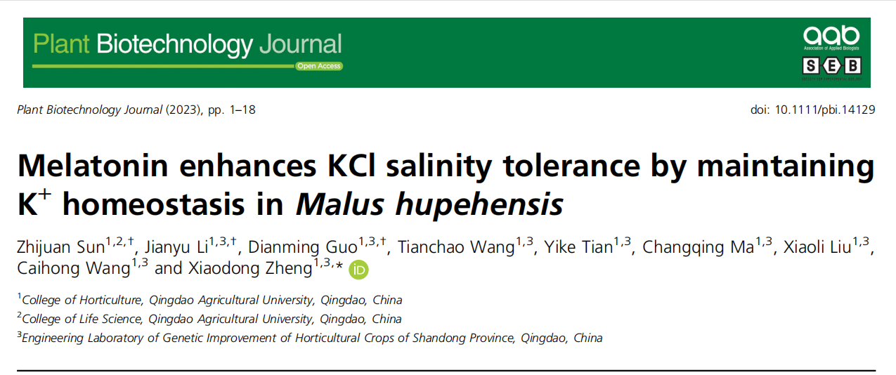 2023年7月19日,mk体育王彩虹教授课题组在Plant Biotechnology Journal(一区TOP期刊,影响因子13.8)在线发表了题为“Melatonin enhances KCl salinity tolerance by maintaining K+ homeostasis in Malus hupehensis”的研究论文。该研究通过对KCl胁迫下的不同抗性砧木进行外源褪黑素处理,发现褪黑素可以缓解它们受到的KCl胁迫,之后通过ChIP-seq、EMSA等试验系统的揭示了褪黑素通过MT-WRKY53-GORK1/NHX2通路维持细胞钾离子稳态,提高苹果对KCl胁迫抗性的调控机制。