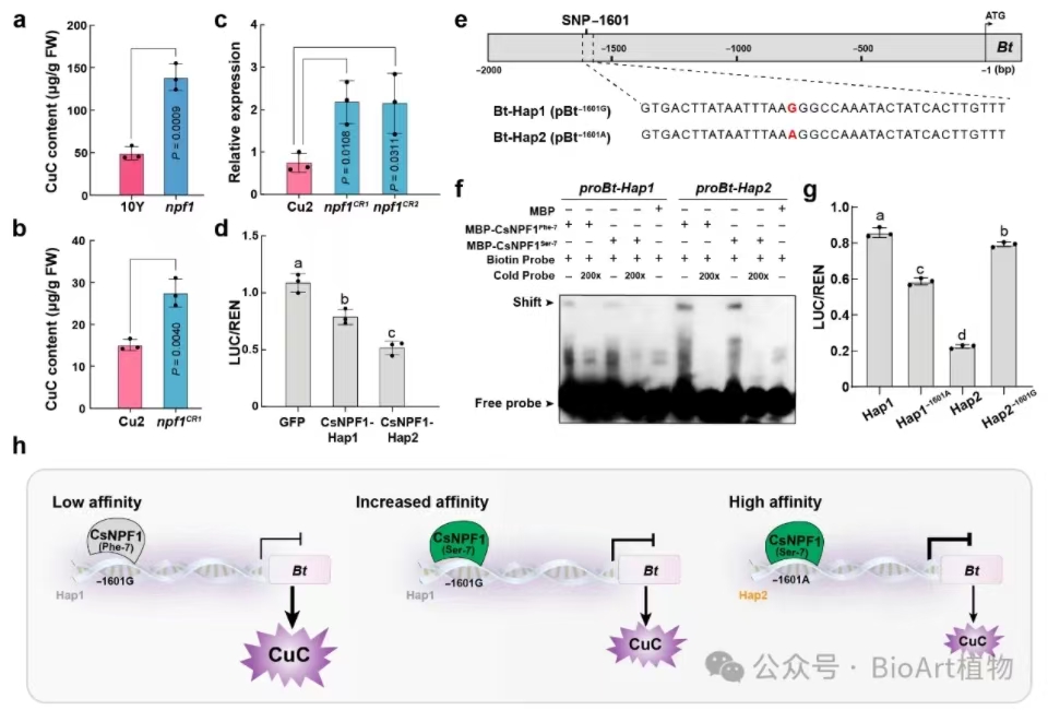 此外,苦味是黄瓜驯化中的重要农艺性状,其中Bt基因作为关键的苦味调控基因,其上游是否存在更高水平的驯化基因,目前未见报道。该研究发现,CsNPF1蛋白能够直接结合Bt基因已知的重要驯化位点,抑制Bt的表达,降低黄瓜果实的苦味(降低黄瓜果实葫芦素CuC含量)(图4)。