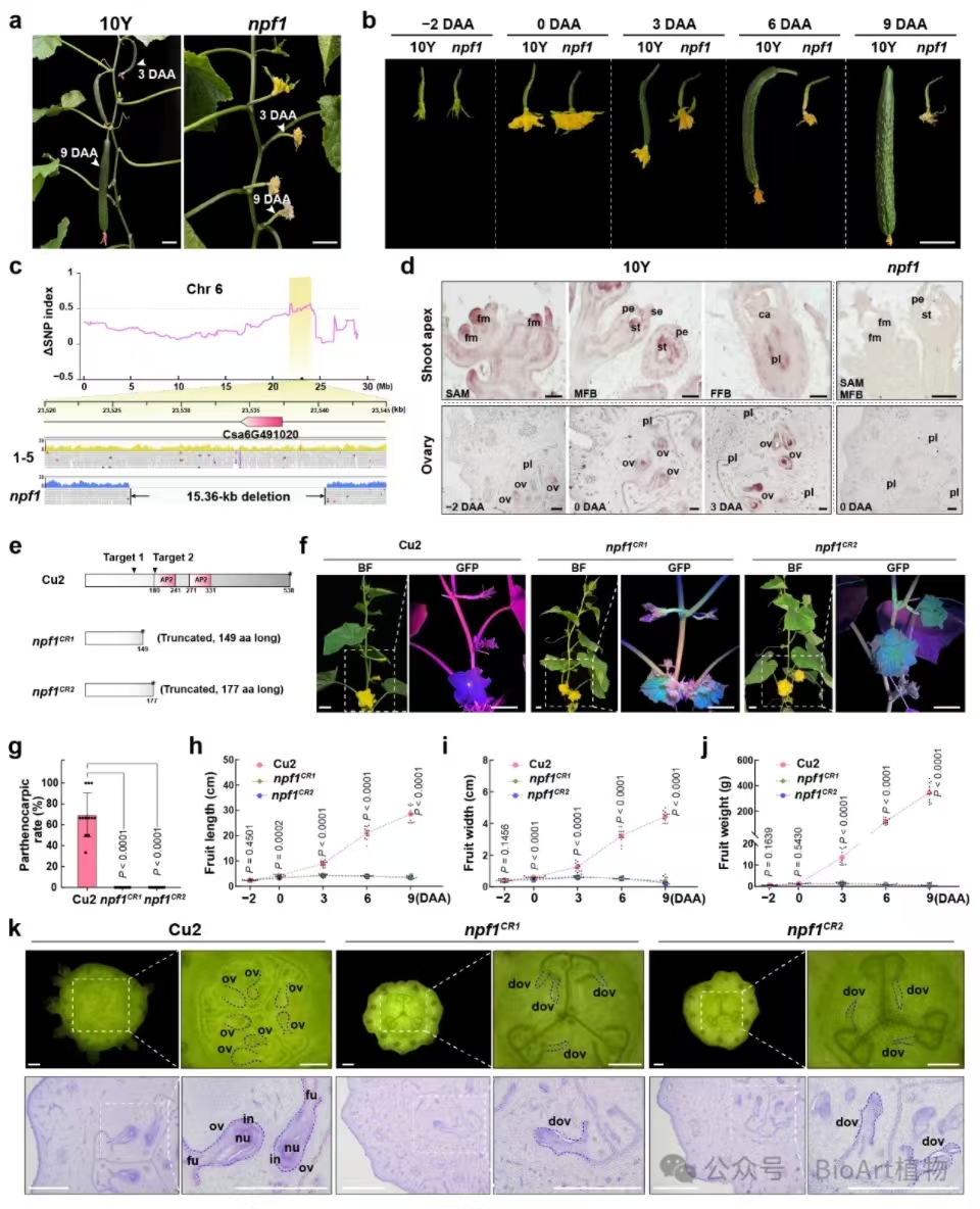 该研究首先利用合作单位天津市农业科公司黄瓜研究所提供的自发非单性结实突变体npf1(non-parthenocarpic fruit 1)进行基因定位(图1),结合BSA-seq和KASP基因分型的数据发现,突变体npf1的第6号染色体上存在一个约15kb的缺失片段,此片段内仅存在一个候选基因,编码AP2转录因子,并将其命名为CsNPF1用于后续研究。CsNPF1在花分生组织、花原基和果实胚珠中高丰度表达。基于CRISPR/Cas9基因编辑技术敲除CsNPF1基因,获得稳定遗传突变体npf1CR1和npf1CR2,该突变体株系出现非单性结实表型,表明CsNPF1在黄瓜单性结实果实形成过程中发挥关键作用。